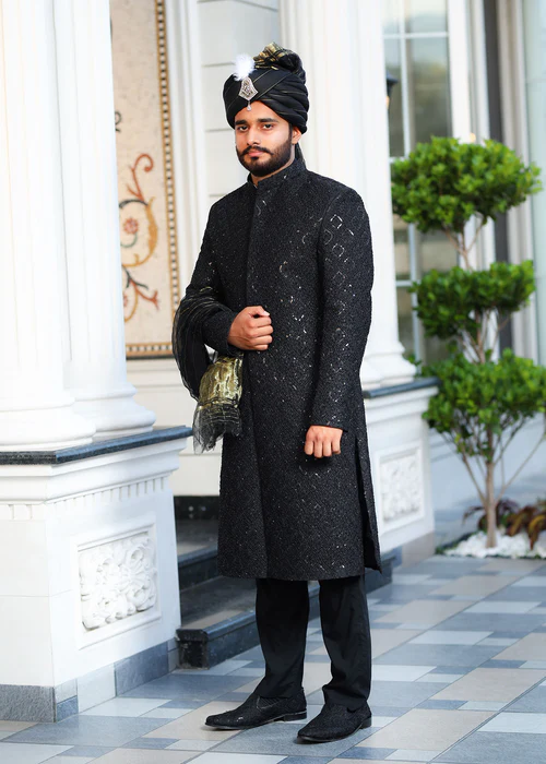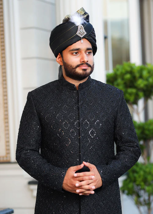 Black embroidered fabric, embelished on front and arms, high quality finsihing and stitching.