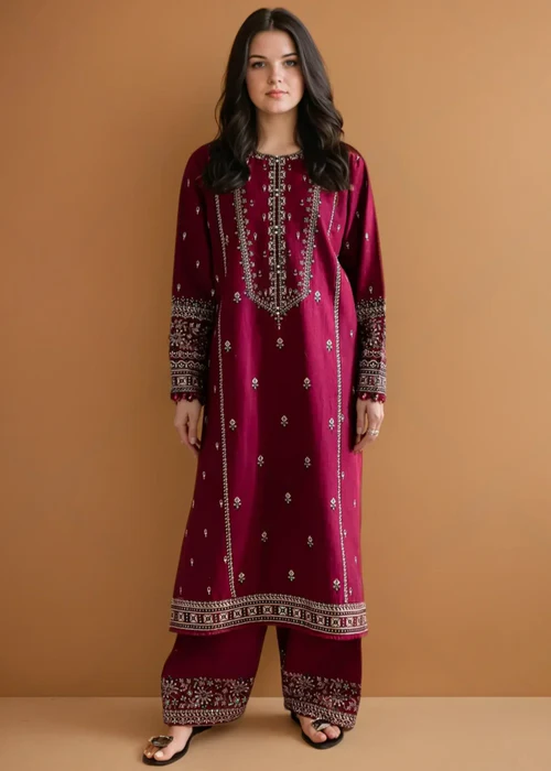 This exquisite Daily/Basic Wear Kurta Set is perfect for summar days. Crafted from comfortable cotton fabrics, the long maroon kurta features intricate embroidery for a touch of elegance. Paired with straightcotton trousers, this 2-piece set offers a regular fit and effortless style. Elevate your wardrobe with this chic ensemble from Chaudhry Arts.