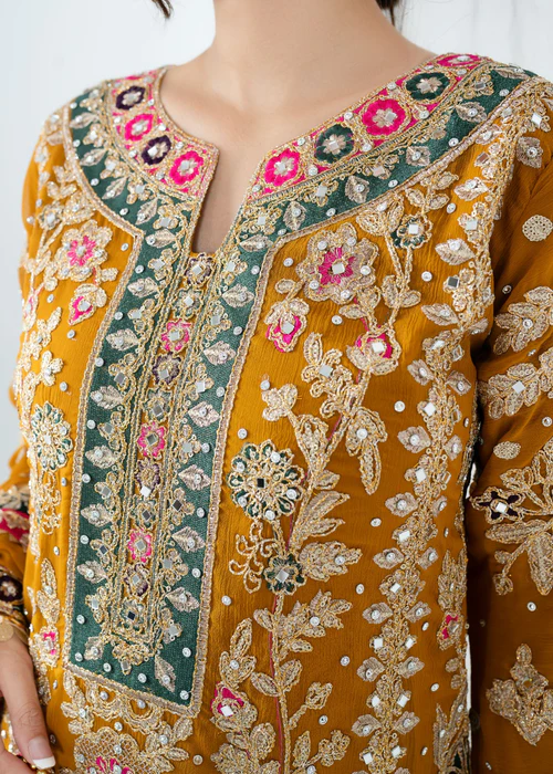 Meena is a four piece stitched long shirt paired with plazo pants adorned with beautiful multi coloured embroidery.